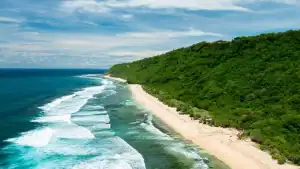Pantai yang benar-benar tepat untuk bersantai dengan pasir putih, ombak tenang dan suasana damai.